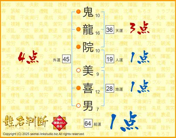 鬼(10画)龍(16画)院(10画) 美(9画)喜(12画)男(7画)