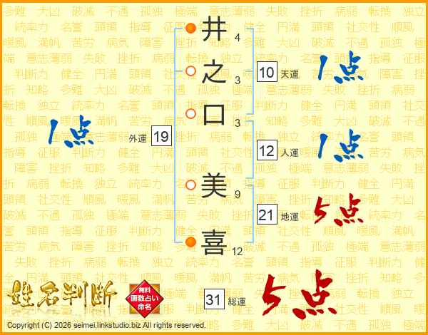 井(4画)之(3画)口(3画) 美(9画)喜(12画)