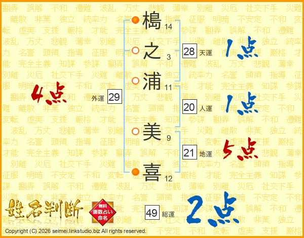 槝(14画)之(3画)浦(11画) 美(9画)喜(12画)