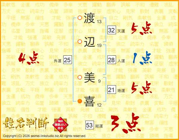 渡(13画)辺(19画) 美(9画)喜(12画)