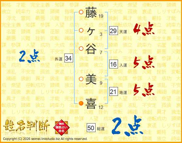藤(19画)ヶ(3画)谷(7画) 美(9画)喜(12画)