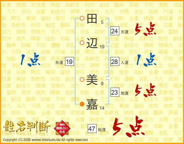 田(5画)辺(19画) 美(9画)嘉(14画)