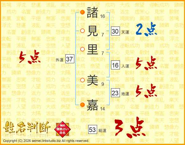 諸(16画)見(7画)里(7画) 美(9画)嘉(14画)