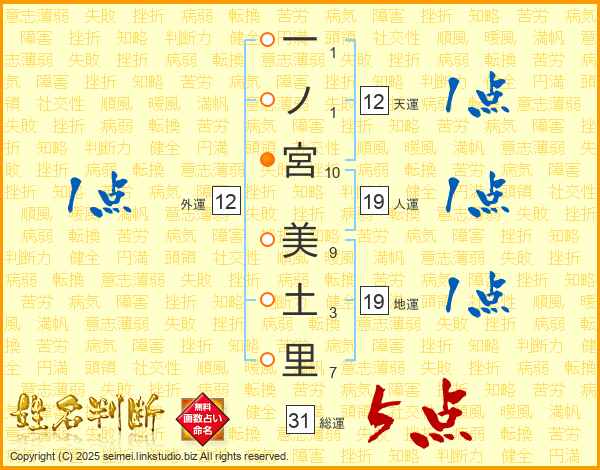一(1画)ノ(1画)宮(10画) 美(9画)土(3画)里(7画)