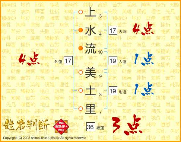 上(3画)水(4画)流(10画) 美(9画)土(3画)里(7画)