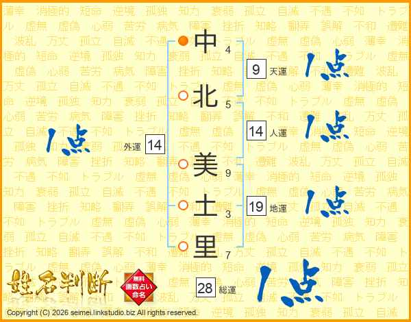 中(4画)北(5画) 美(9画)土(3画)里(7画)