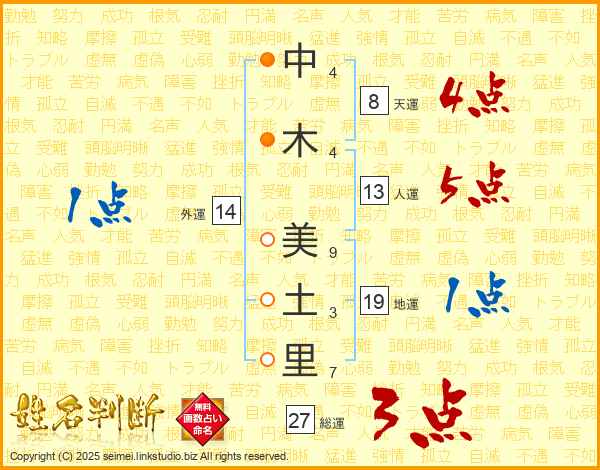 中(4画)木(4画) 美(9画)土(3画)里(7画)