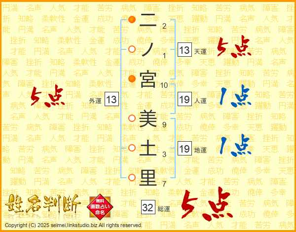 二(2画)ノ(1画)宮(10画) 美(9画)土(3画)里(7画)