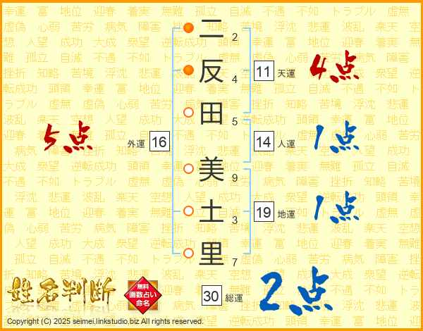 生活面を象徴する運勢です。外部から受ける影響力を表し、結婚運、家庭運や職場、環境への順応性を表します。総運から人運を引いた画数。姓や名が1文字の場合を除く。