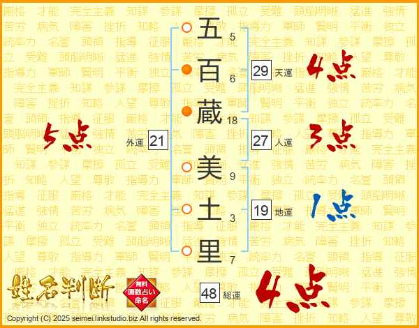 五(5画)百(6画)蔵(18画) 美(9画)土(3画)里(7画)