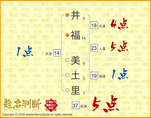 井(4画)福(14画) 美(9画)土(3画)里(7画)