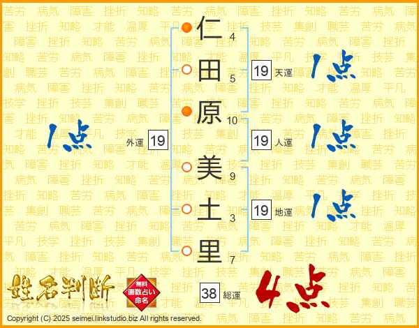 仁(4画)田(5画)原(10画) 美(9画)土(3画)里(7画)