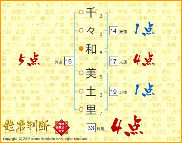千(3画)々(3画)和(8画) 美(9画)土(3画)里(7画)