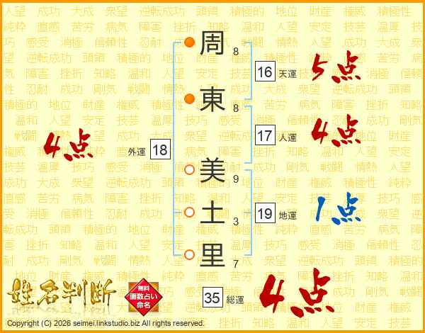 周(8画)東(8画) 美(9画)土(3画)里(7画)