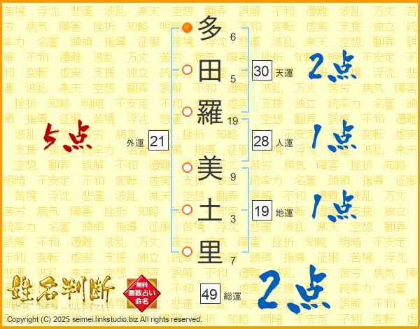 多(6画)田(5画)羅(19画) 美(9画)土(3画)里(7画)