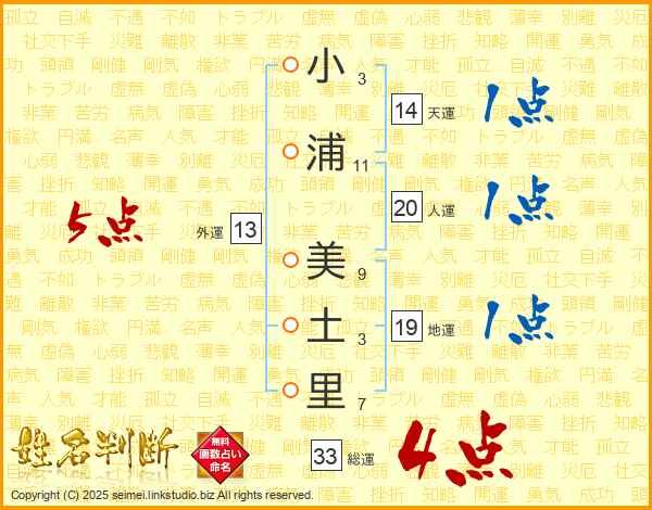 小(3画)浦(11画) 美(9画)土(3画)里(7画)