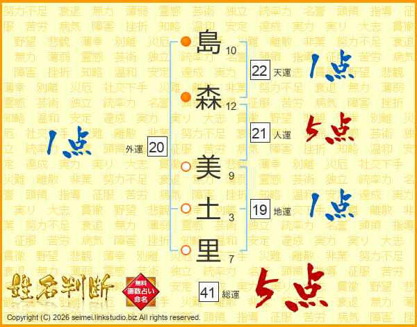島(10画)森(12画) 美(9画)土(3画)里(7画)