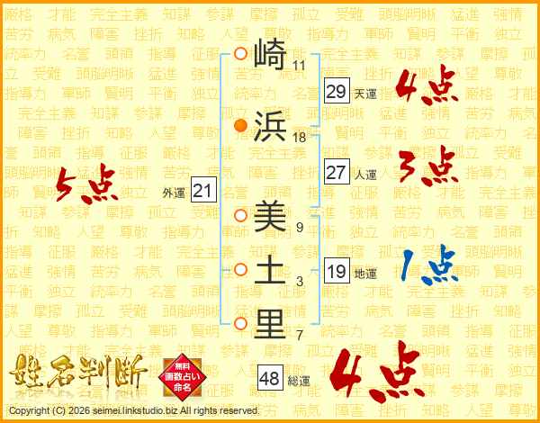 崎(11画)浜(18画) 美(9画)土(3画)里(7画)