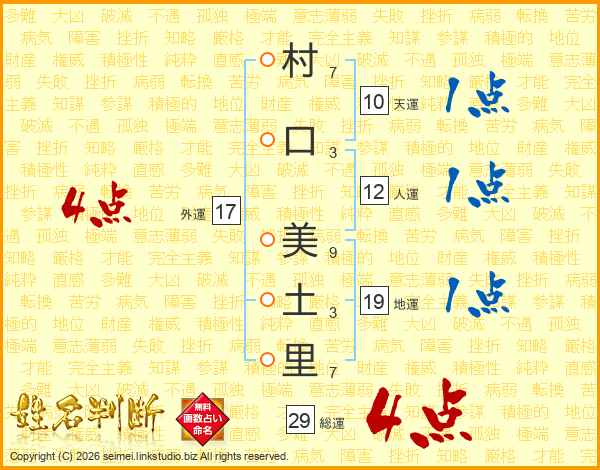 村(7画)口(3画) 美(9画)土(3画)里(7画)