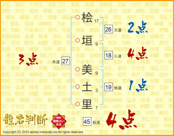 桧(17画)垣(9画) 美(9画)土(3画)里(7画)