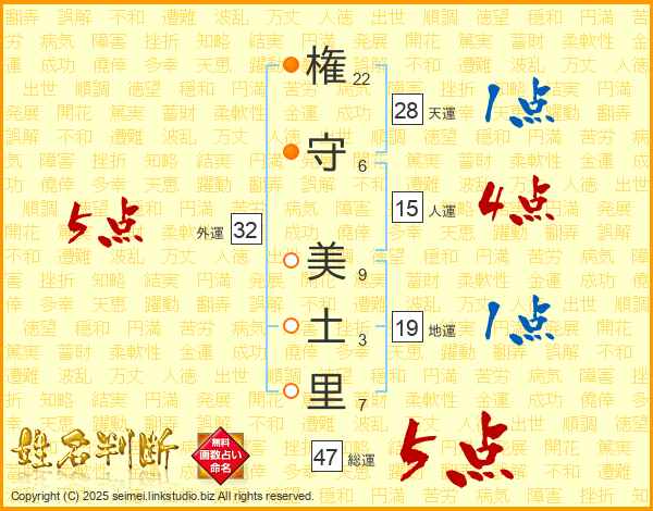 権(22画)守(6画) 美(9画)土(3画)里(7画)