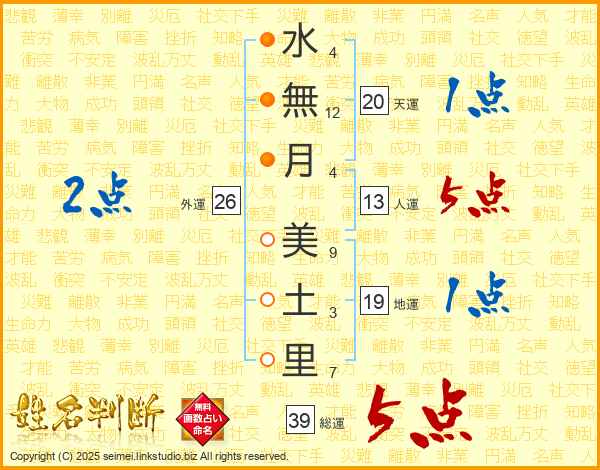 水(4画)無(12画)月(4画) 美(9画)土(3画)里(7画)