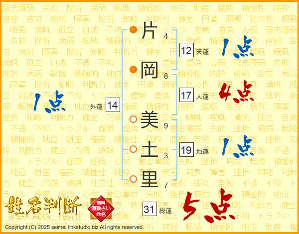 片(4画)岡(8画) 美(9画)土(3画)里(7画)