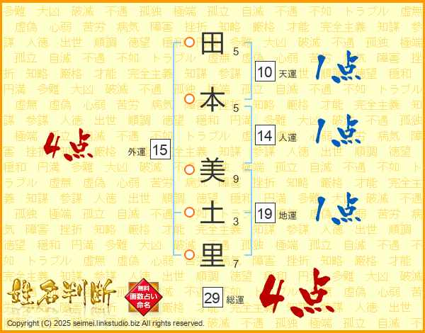 田(5画)本(5画) 美(9画)土(3画)里(7画)