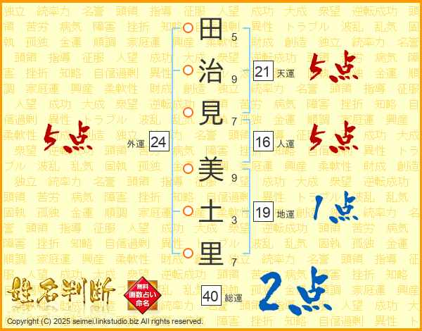 田(5画)治(9画)見(7画) 美(9画)土(3画)里(7画)
