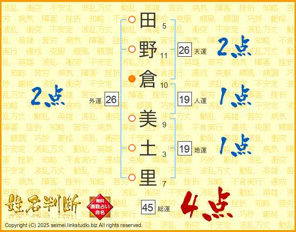 生活面を象徴する運勢です。外部から受ける影響力を表し、結婚運、家庭運や職場、環境への順応性を表します。総運から人運を引いた画数。姓や名が1文字の場合を除く。
