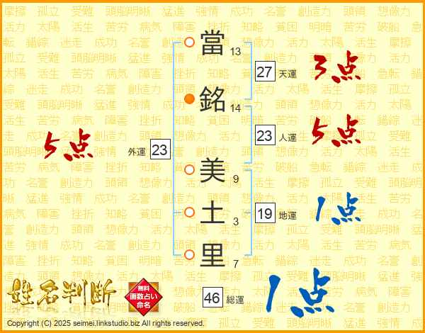 當(13画)銘(14画) 美(9画)土(3画)里(7画)
