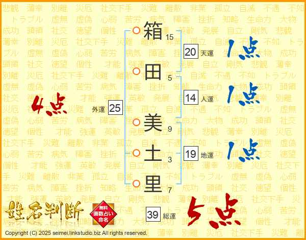 箱(15画)田(5画) 美(9画)土(3画)里(7画)