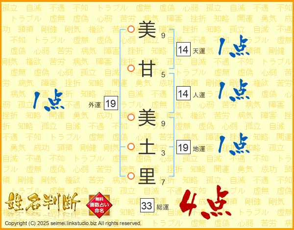 美(9画)甘(5画) 美(9画)土(3画)里(7画)
