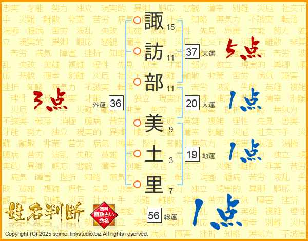 諏(15画)訪(11画)部(11画) 美(9画)土(3画)里(7画)
