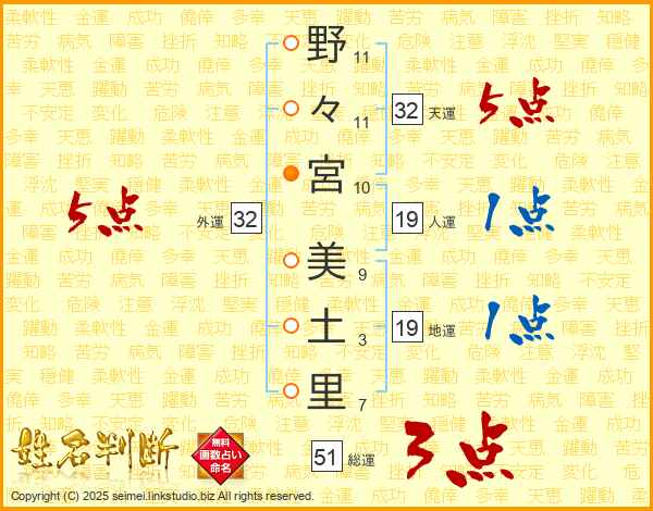 野(11画)々(11画)宮(10画) 美(9画)土(3画)里(7画)