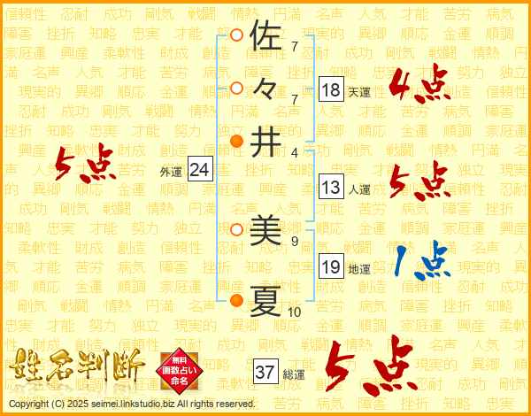 佐(7画)々(7画)井(4画) 美(9画)夏(10画)
