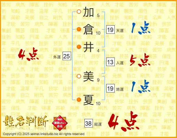 加(5画)倉(10画)井(4画) 美(9画)夏(10画)