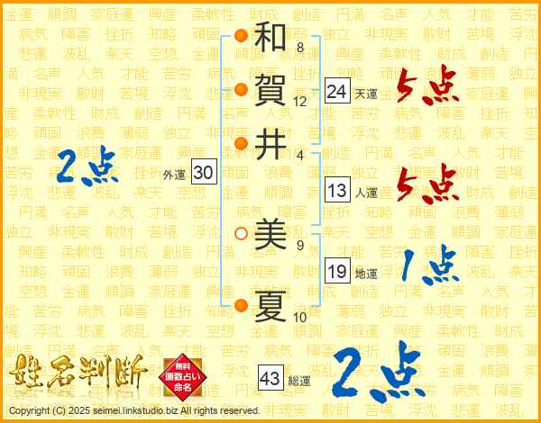 和(8画)賀(12画)井(4画) 美(9画)夏(10画)