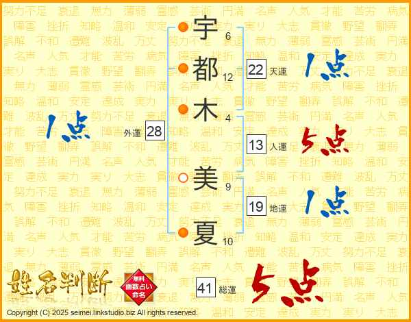 宇(6画)都(12画)木(4画) 美(9画)夏(10画)