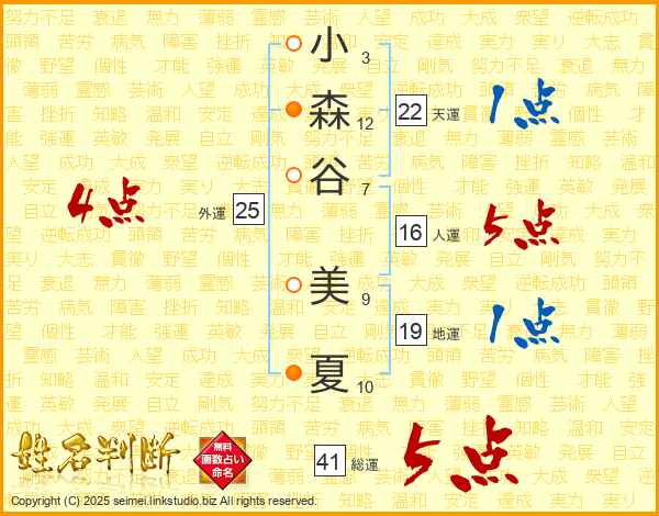 小(3画)森(12画)谷(7画) 美(9画)夏(10画)