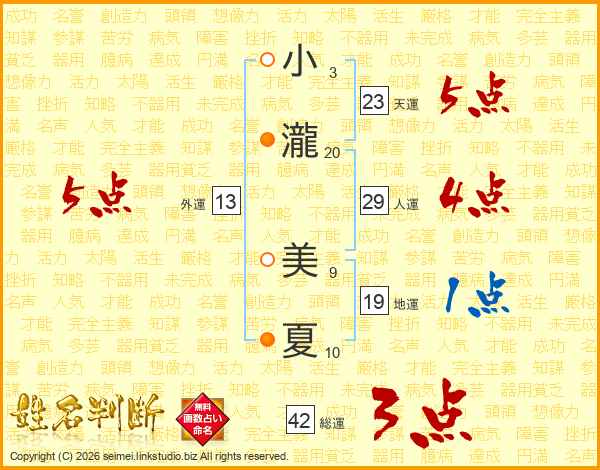 小(3画)瀧(20画) 美(9画)夏(10画)