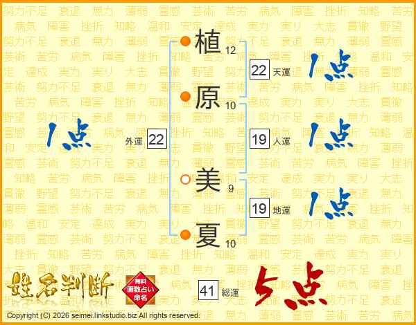 生活面を象徴する運勢です。外部から受ける影響力を表し、結婚運、家庭運や職場、環境への順応性を表します。総運から人運を引いた画数。姓や名が1文字の場合を除く。