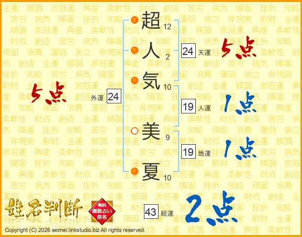 超人気美夏さんの総運は43画の2点!