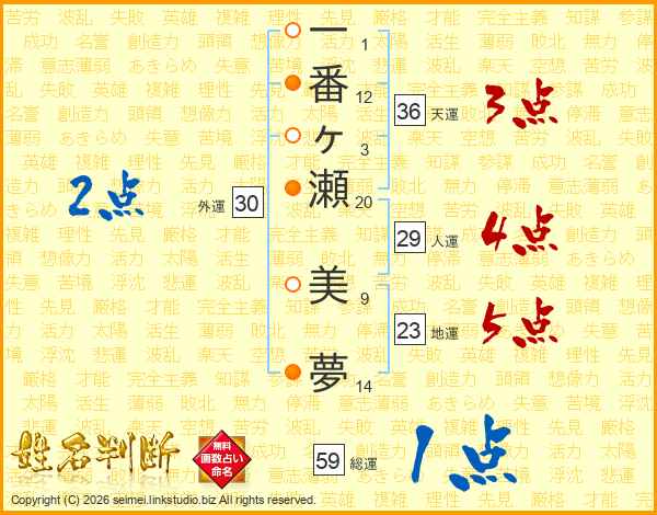 一(1画)番(12画)ヶ(3画)瀬(20画) 美(9画)夢(14画)
