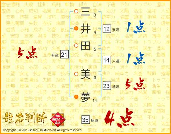 三(3画)井(4画)田(5画) 美(9画)夢(14画)