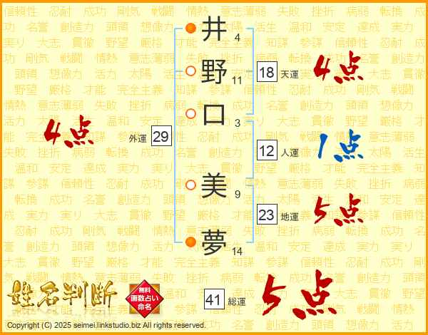 井(4画)野(11画)口(3画) 美(9画)夢(14画)