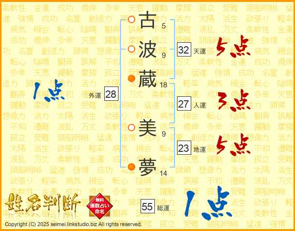 古(5画)波(9画)蔵(18画) 美(9画)夢(14画)