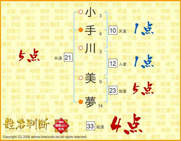 小手川美夢さんの総運は33画の4点!