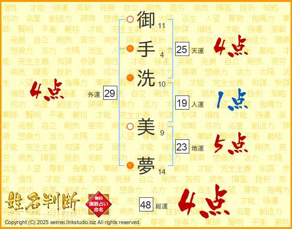御(11画)手(4画)洗(10画) 美(9画)夢(14画)