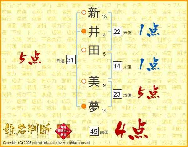 新(13画)井(4画)田(5画) 美(9画)夢(14画)
